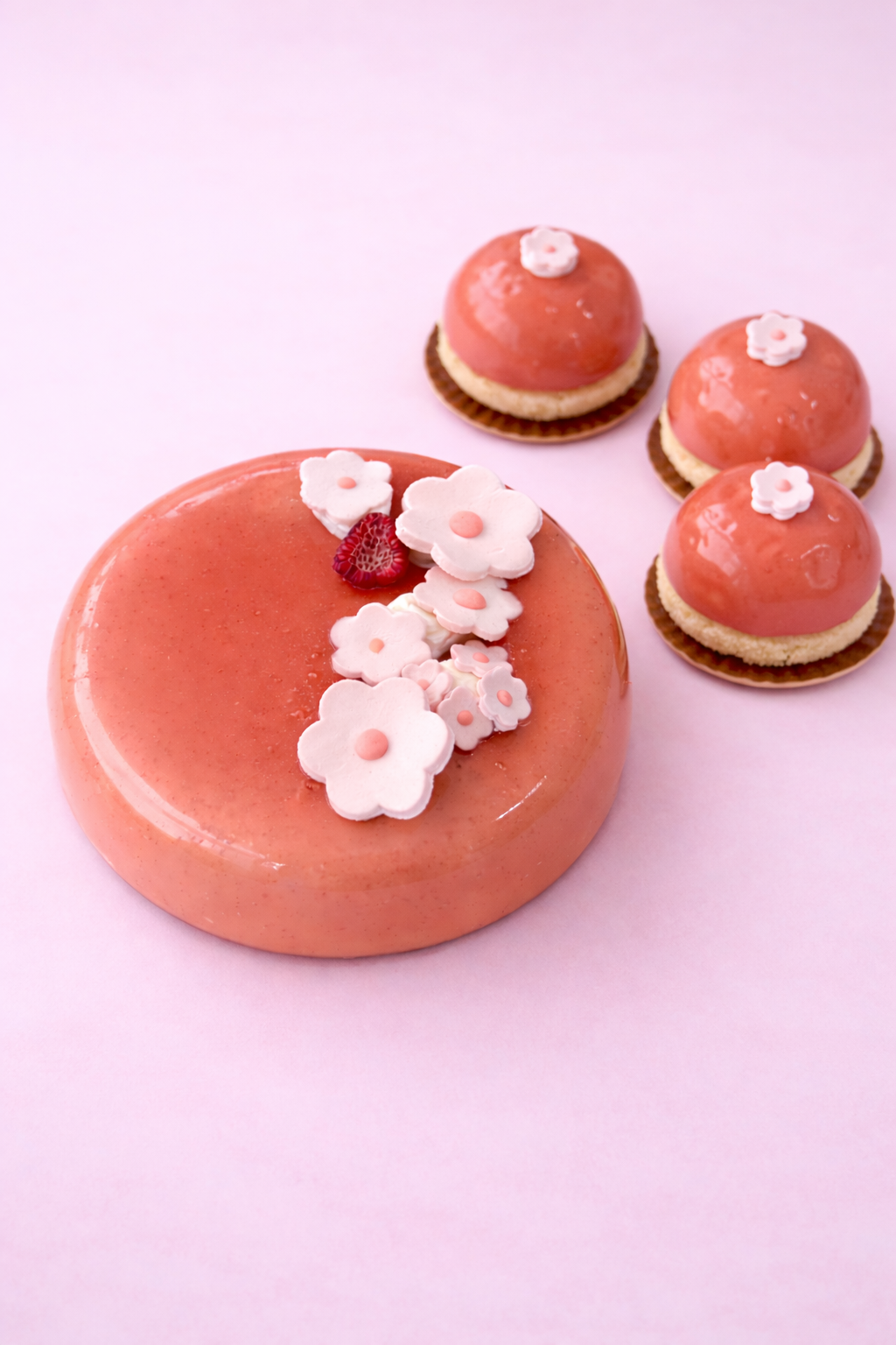 Mousse thé vert parfumé aux fleurs de cerisier, crémeux framboise et gelée de litchi, biscuit madeleine sans gluten au sésame noir