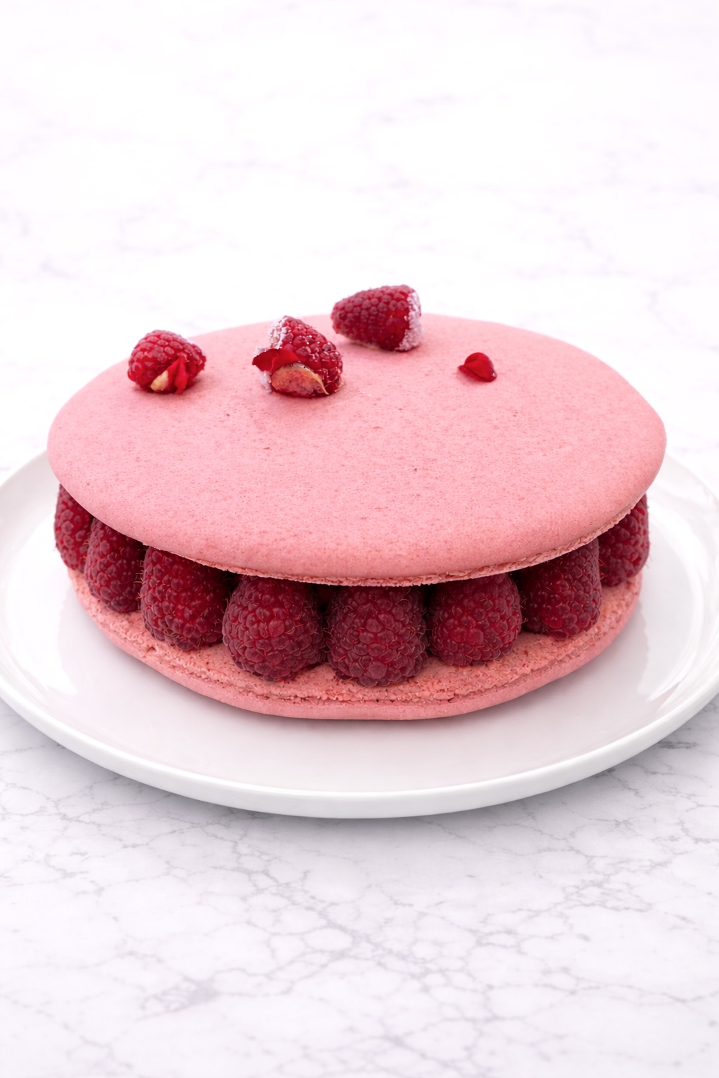 Macaron, crème diplomate vanille , framboises fraîches